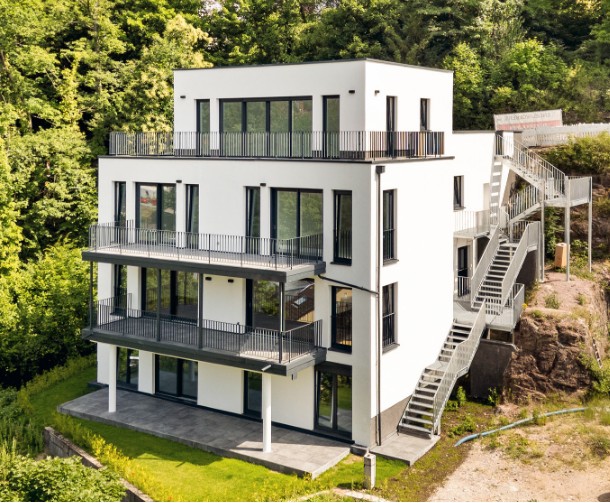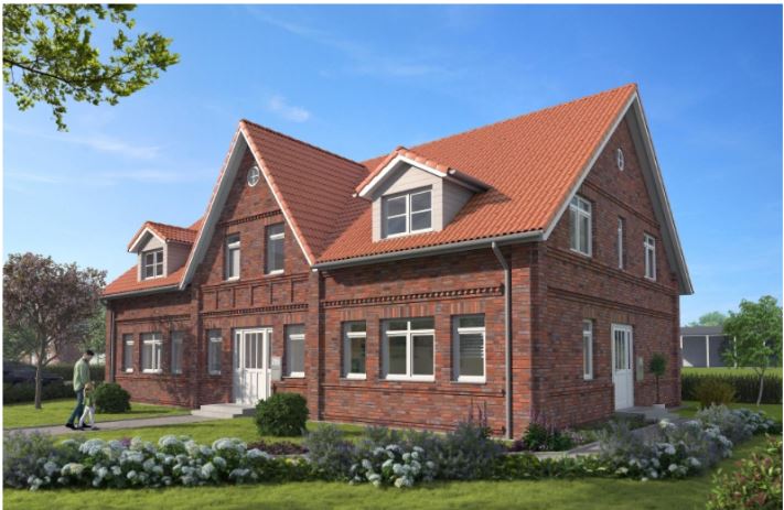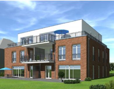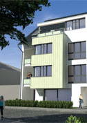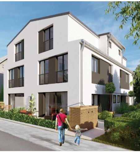 mit zwei Eingängen und zwölf lichtdurchfluteten Wohneinheiten im kfw-Effizienzhaus 70 Standard.